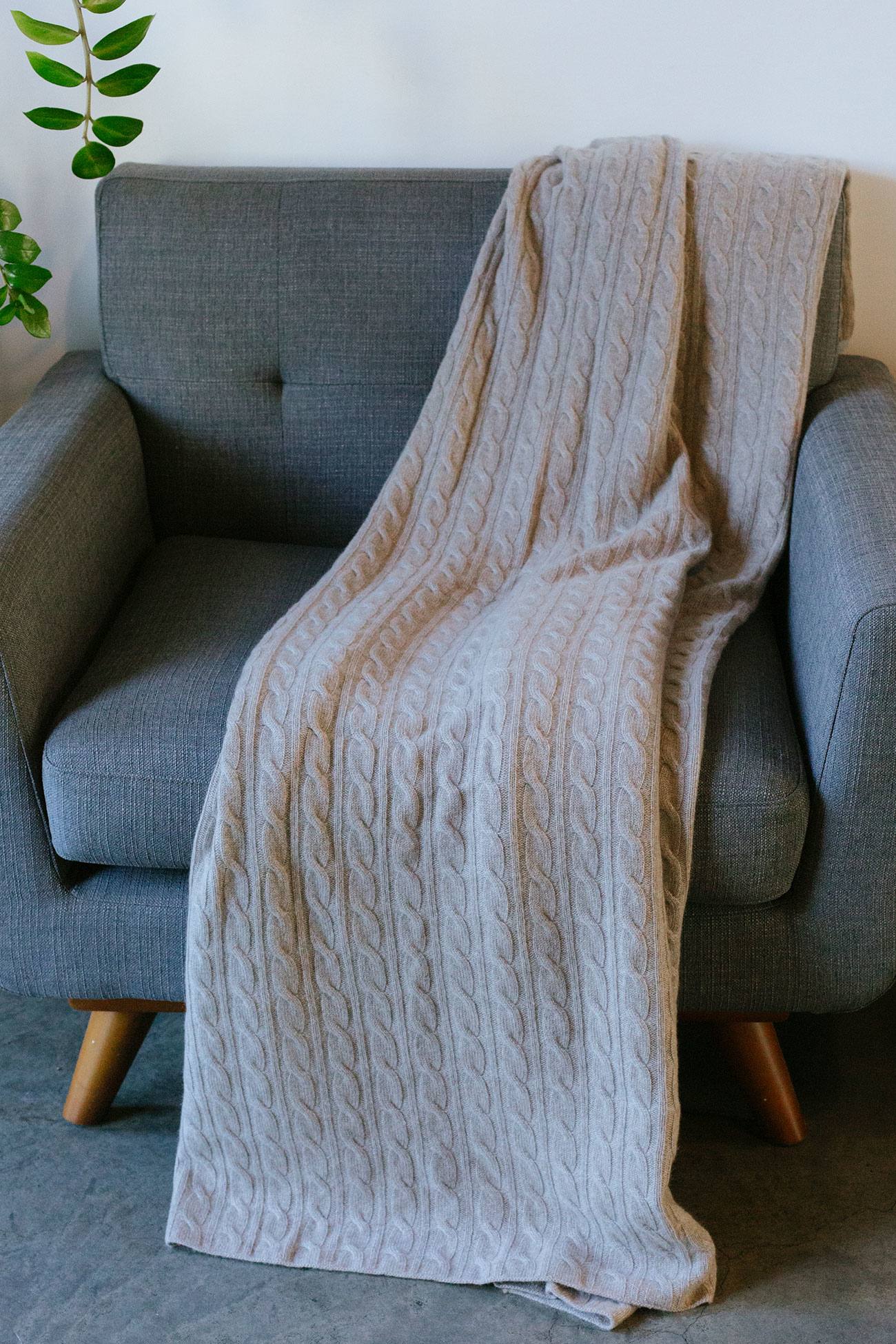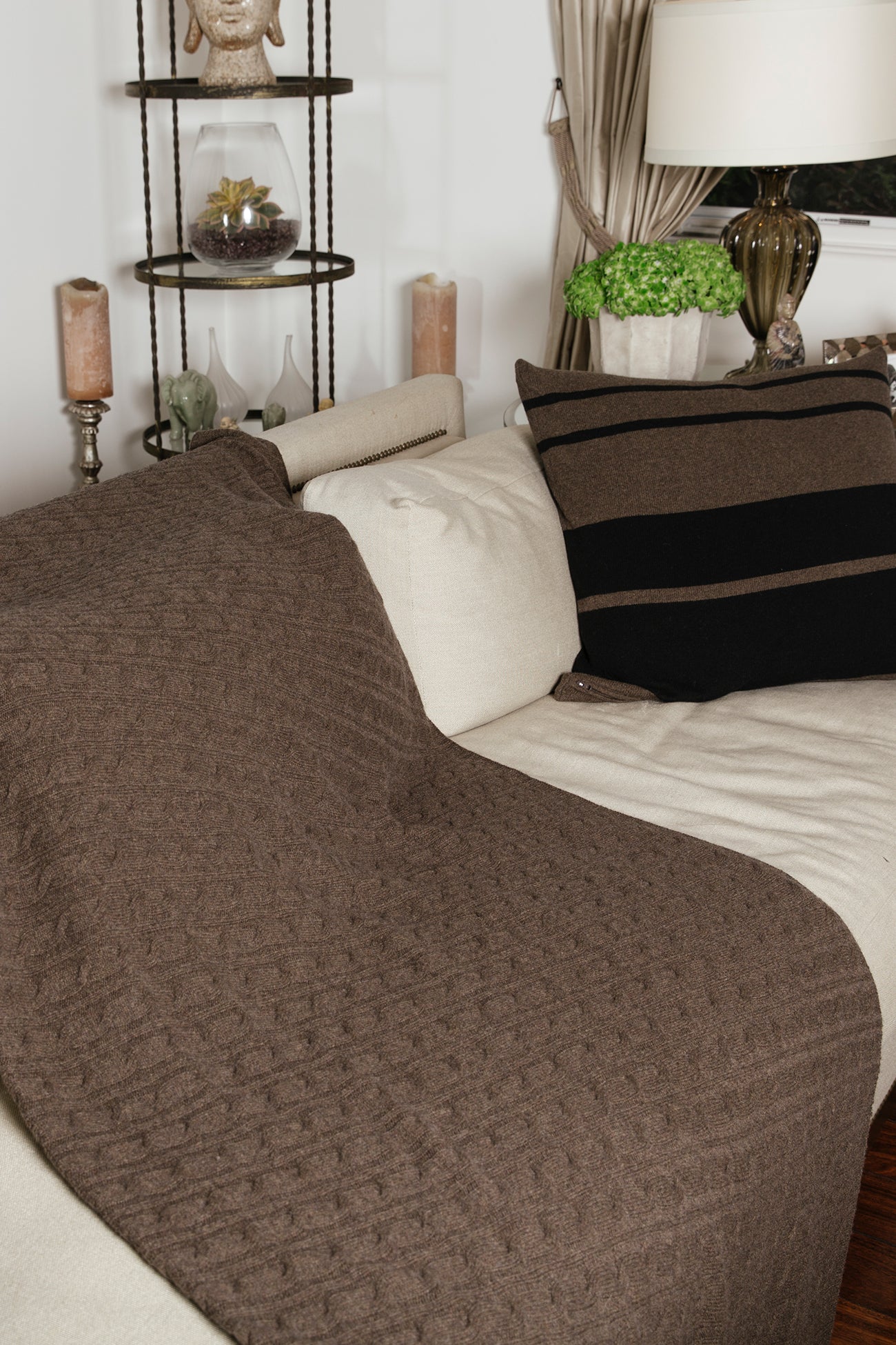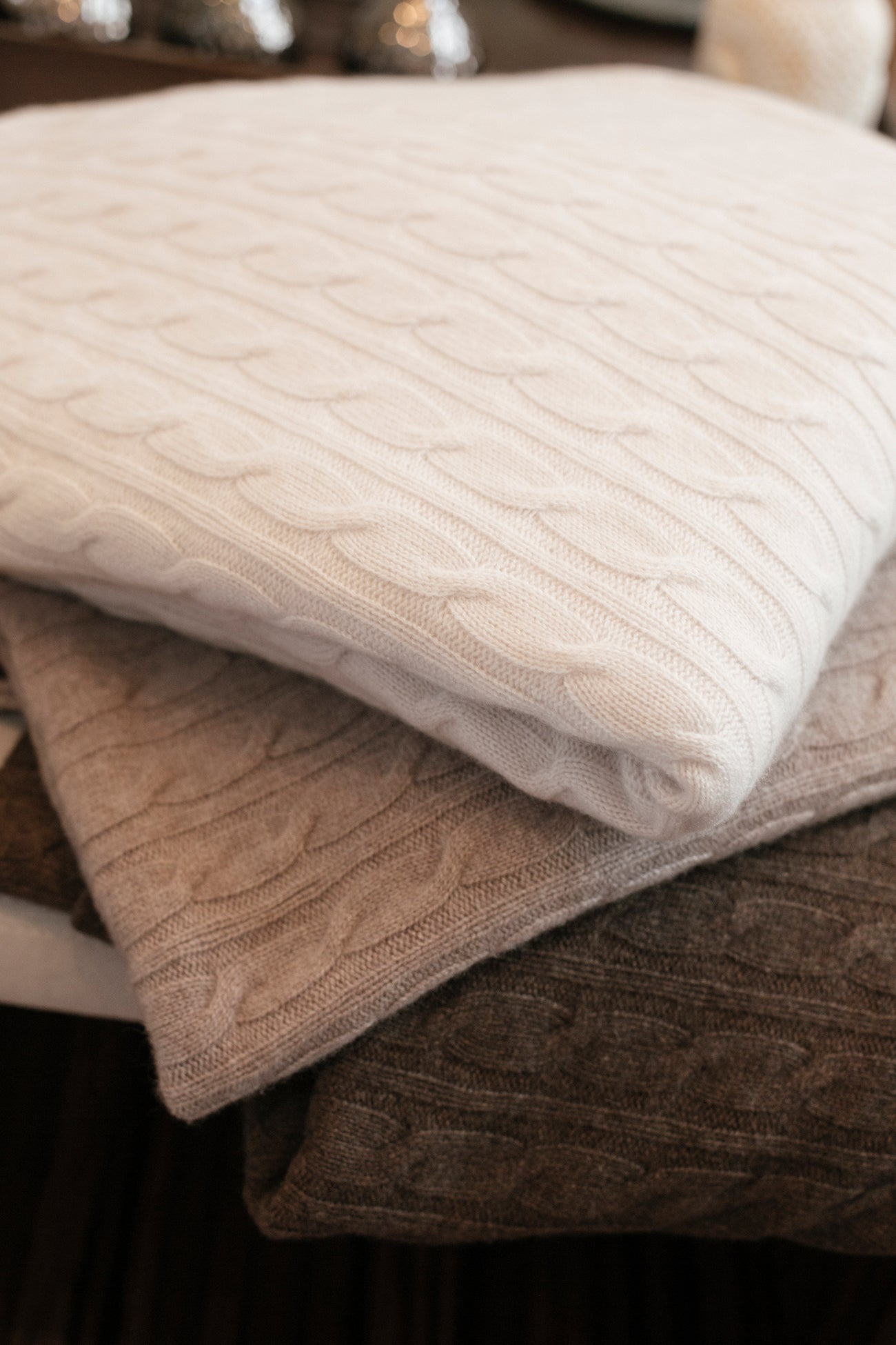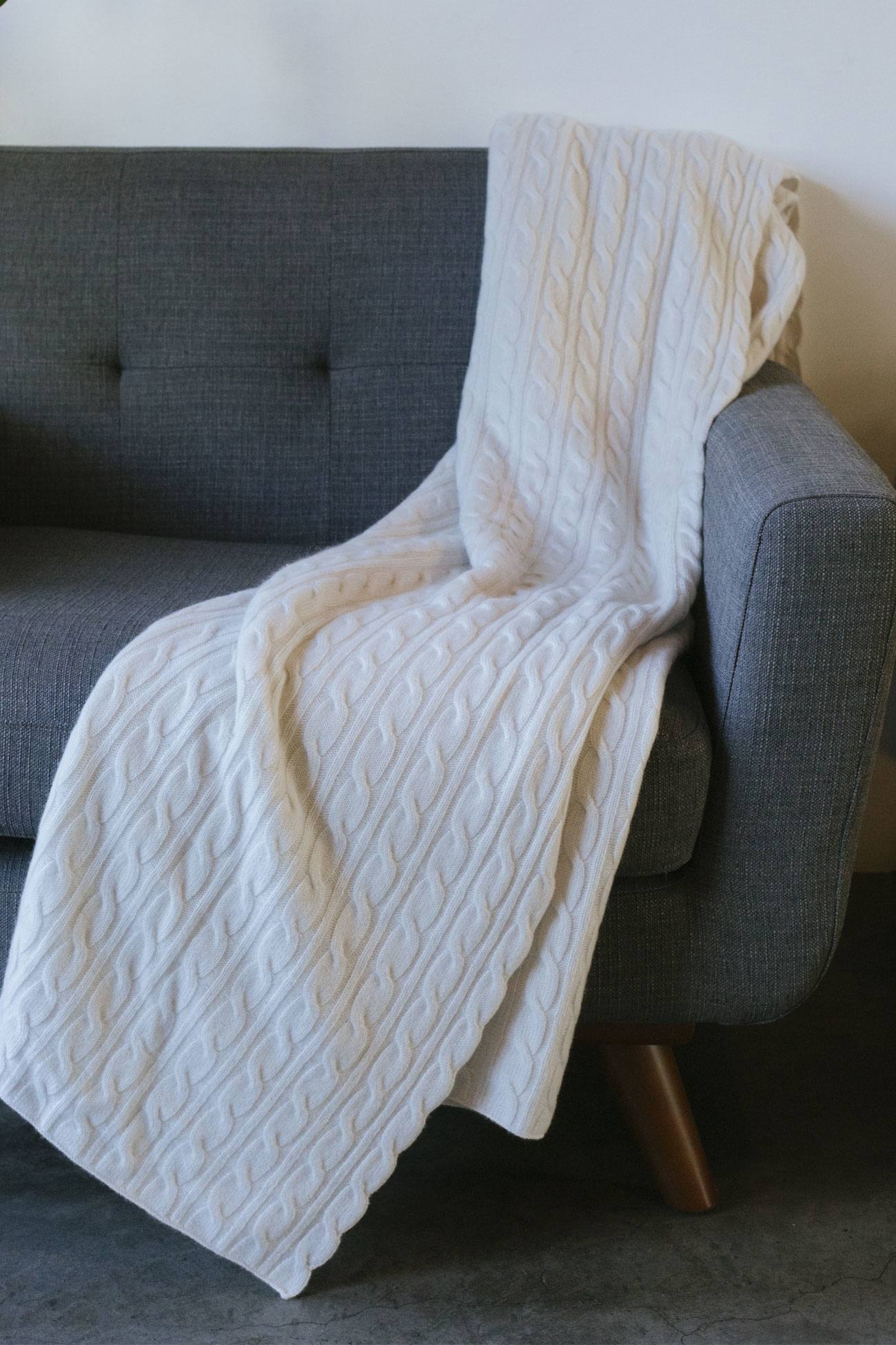 Add a touch of cashmere with our exquisitely soft cable knit blanket. This blanket makes for a luscious bed or couch throw.