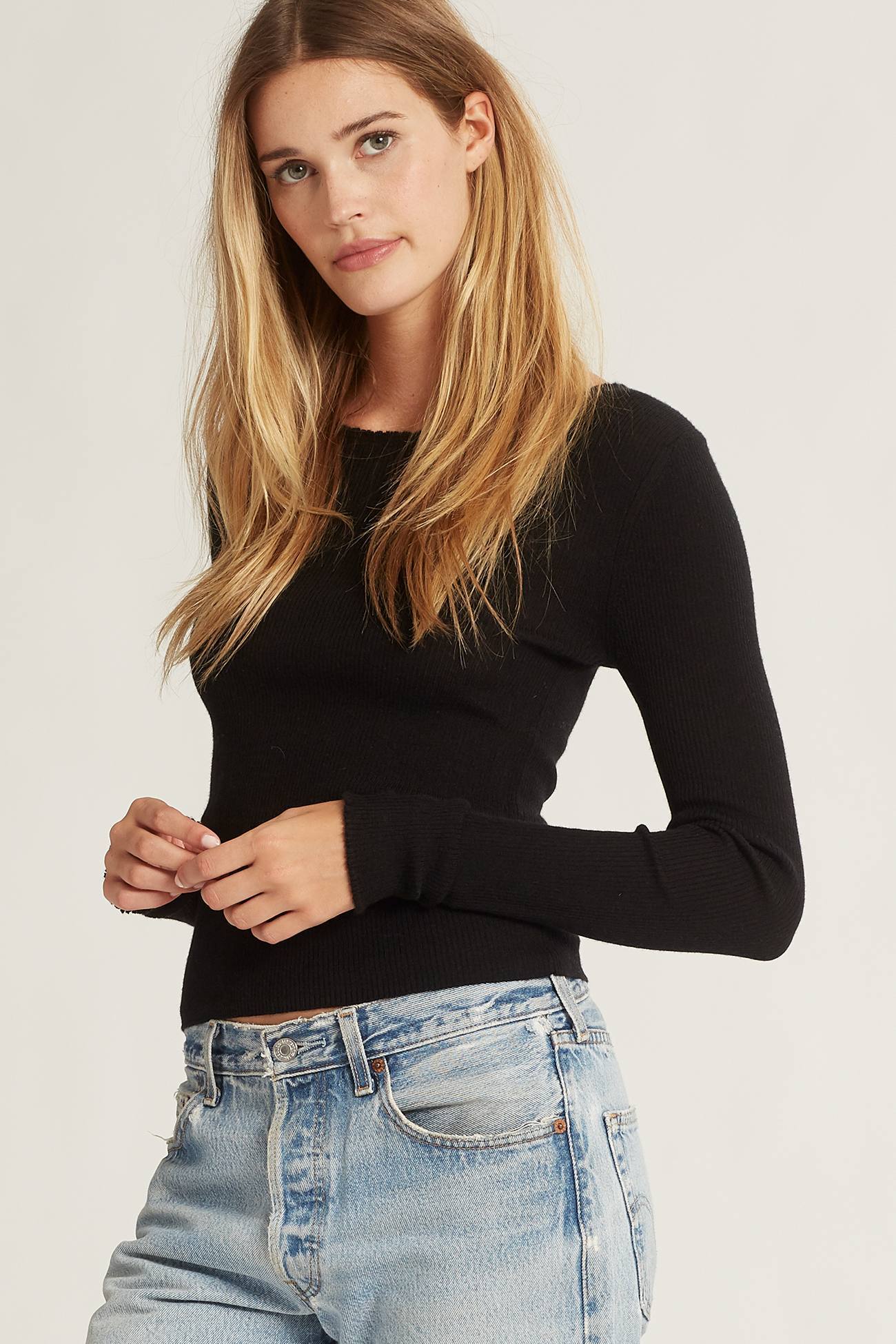 Basic ribbed long sleeve tee enhanced in the softest featherweight cashmere. Complemented with feminine frayed trim along the neckline and cuffs.