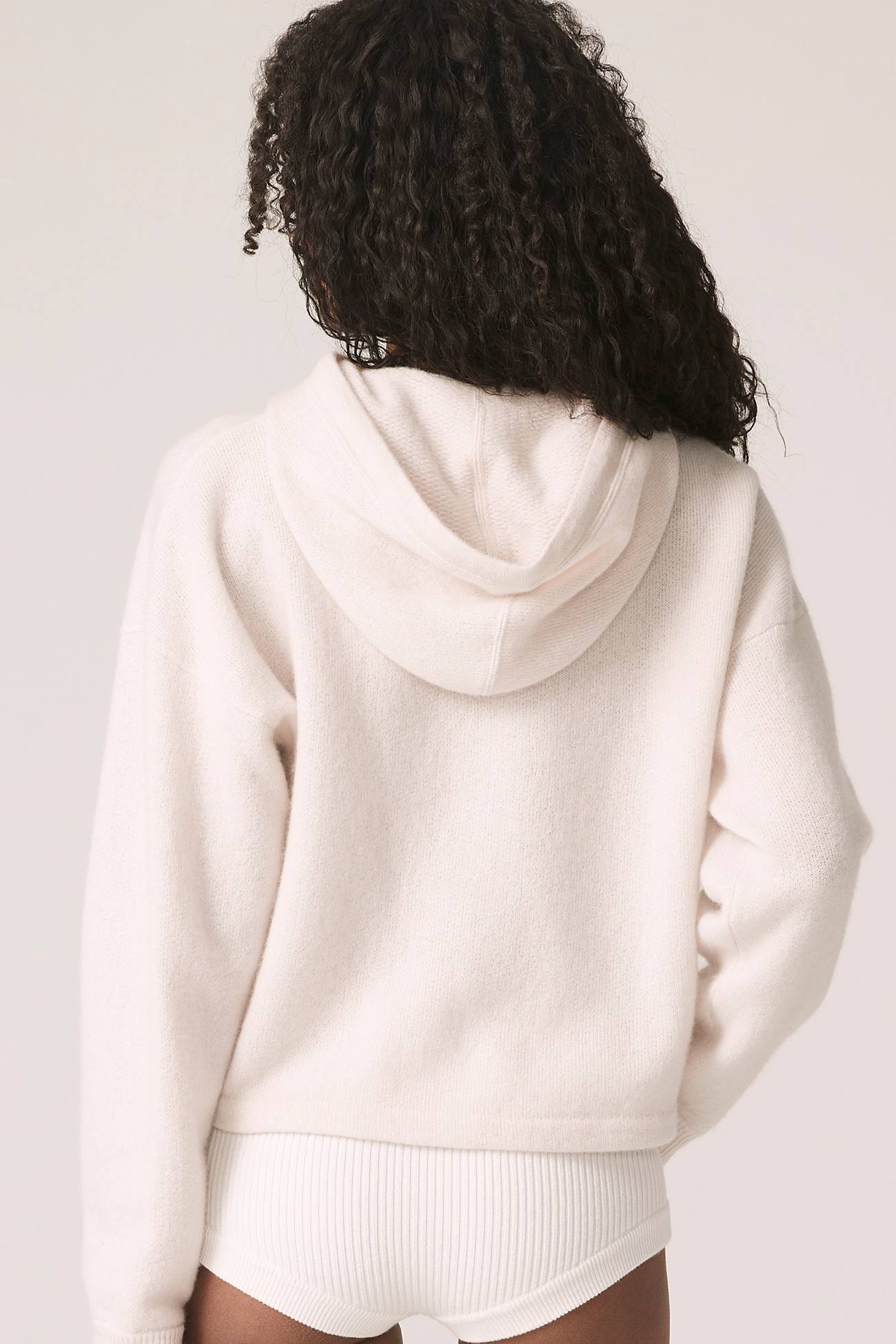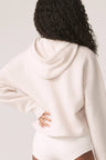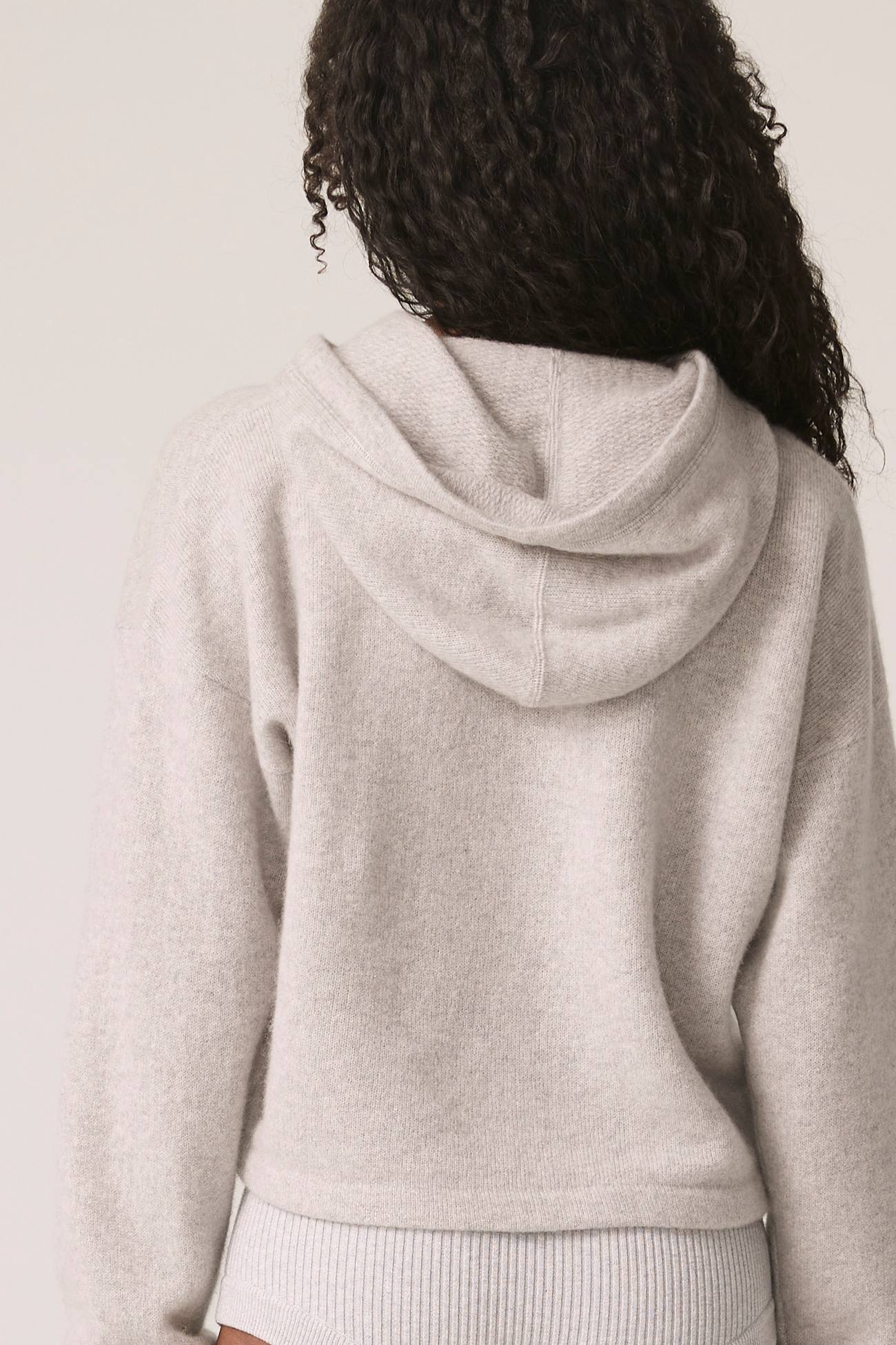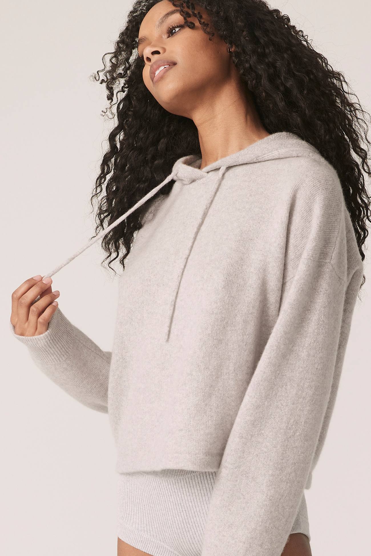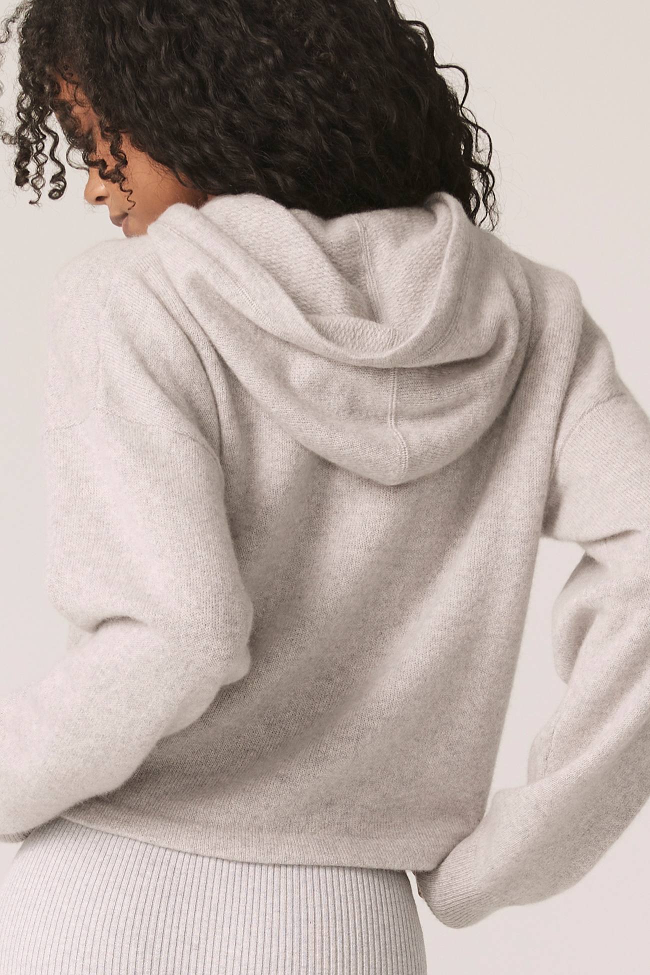 Long sleeve recycled terry cashmere hoodie. Cut in a versatile cropped length, drawstring hood and ribbed cuffs.