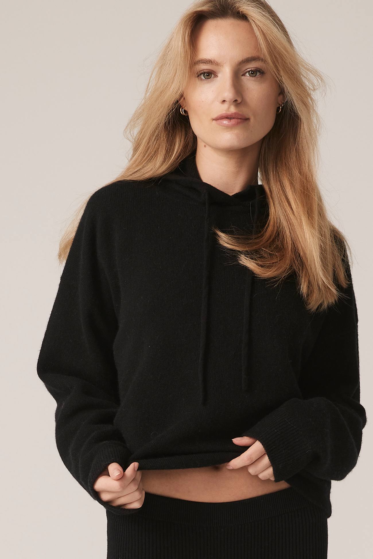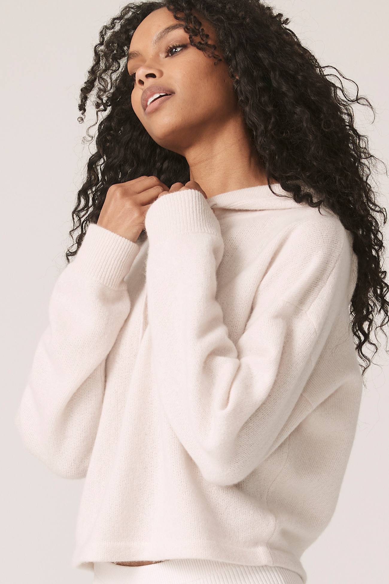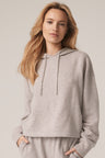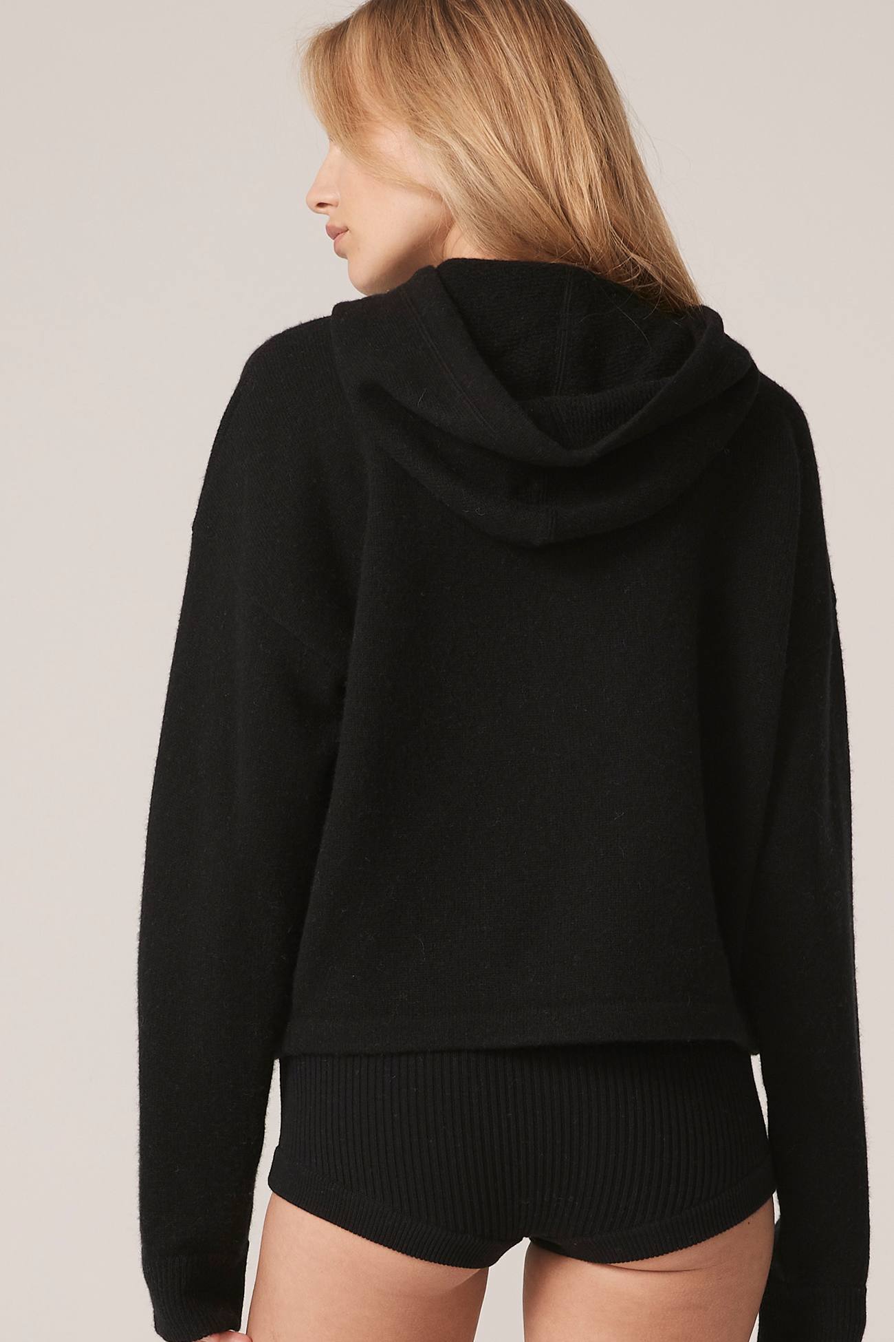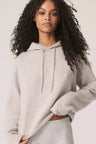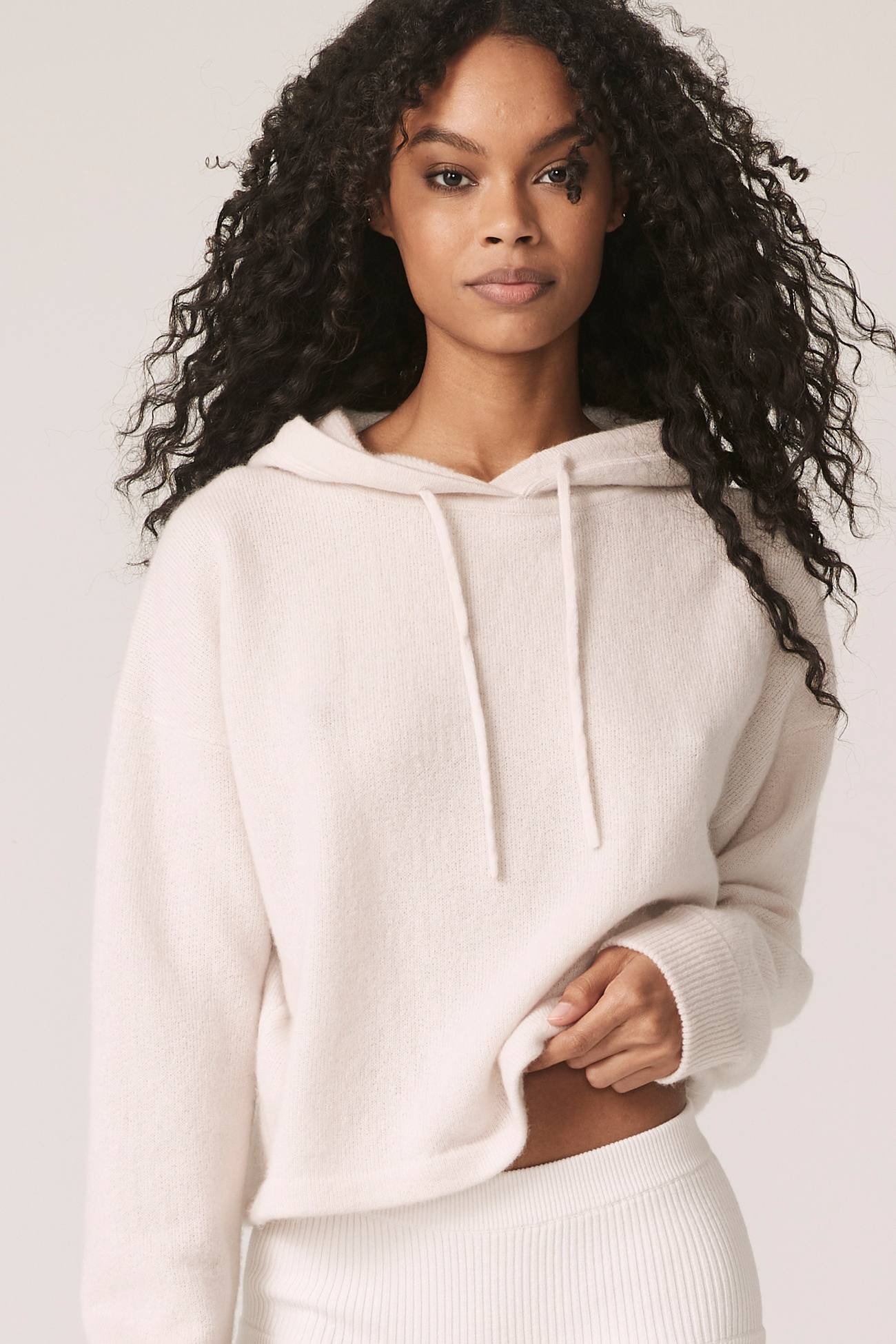 Long sleeve recycled terry cashmere hoodie. Cut in a versatile cropped length, drawstring hood and ribbed cuffs.