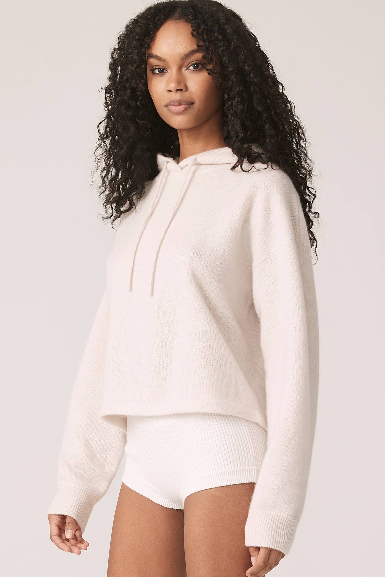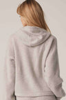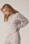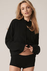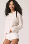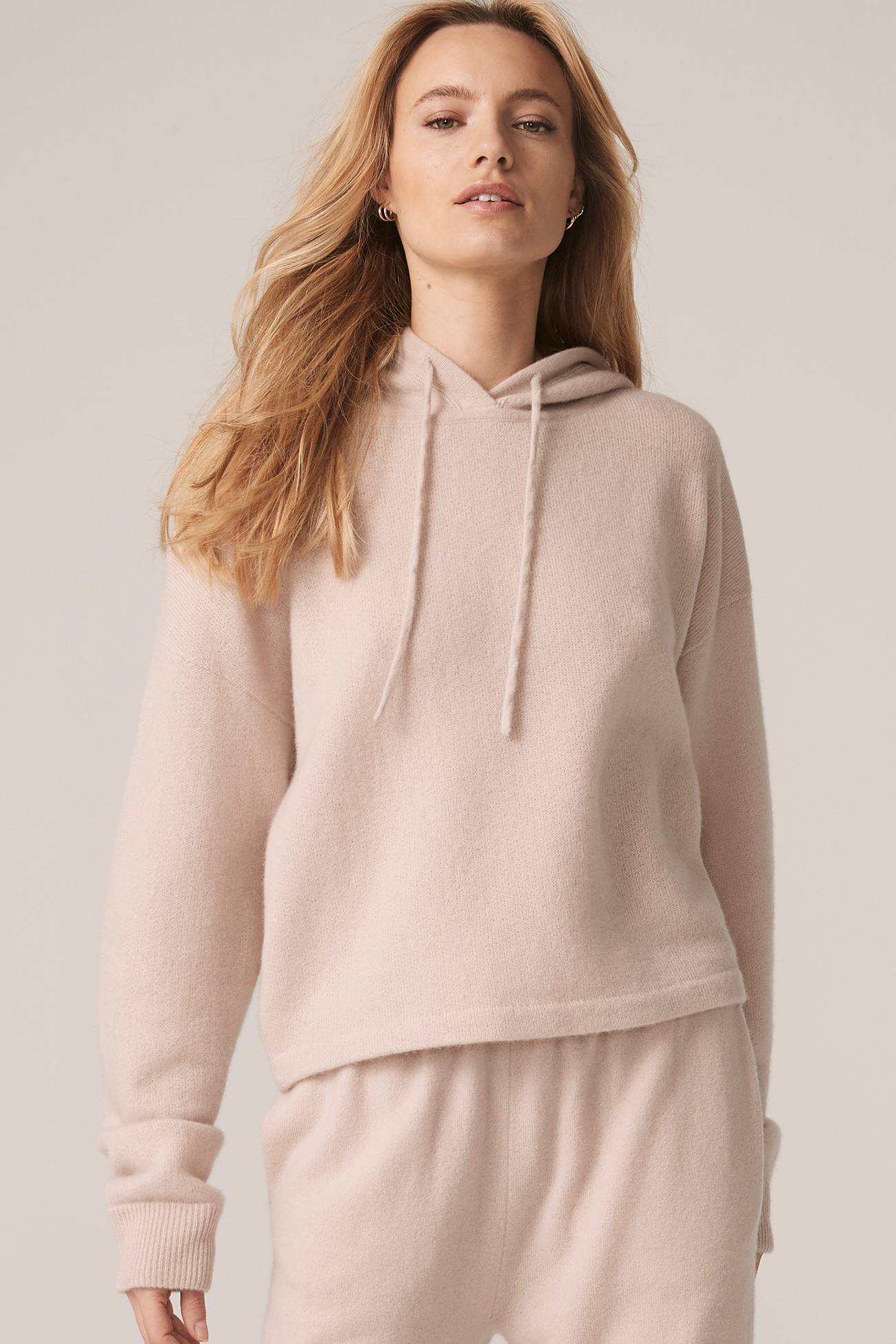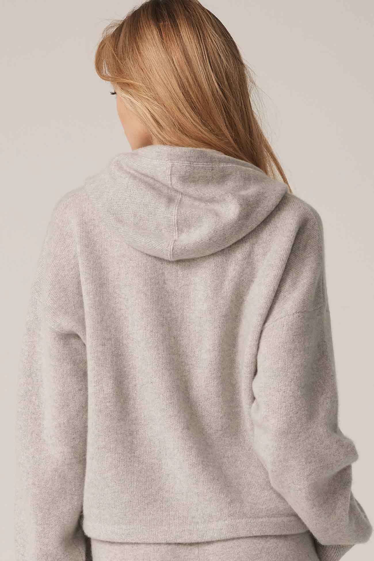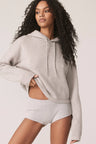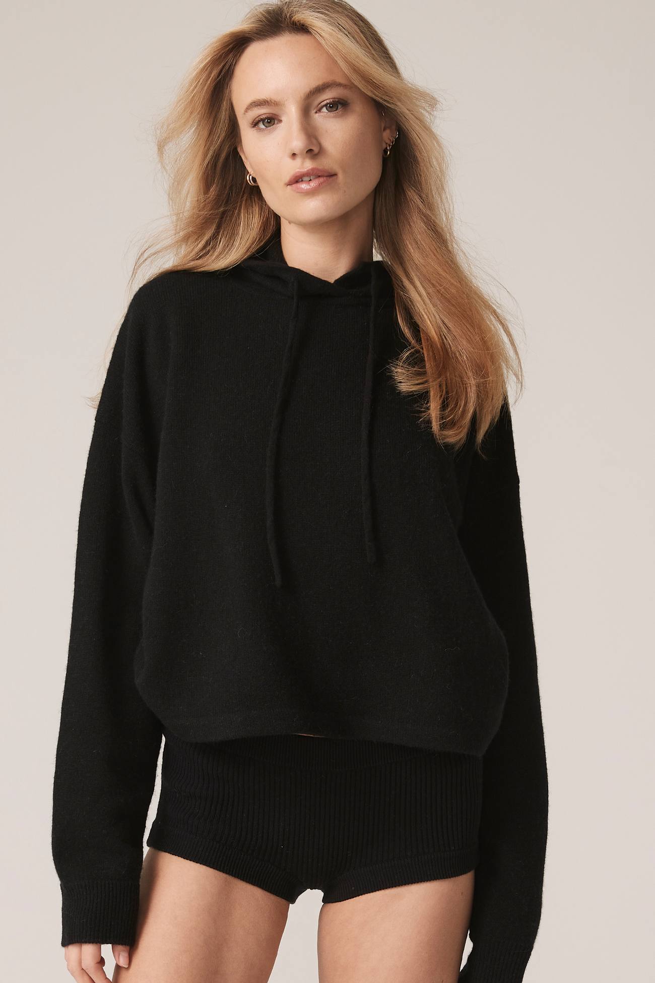 Long sleeve recycled terry cashmere hoodie. Cut in a versatile cropped length, drawstring hood and ribbed cuffs.
