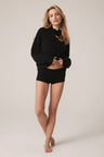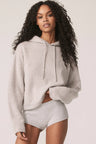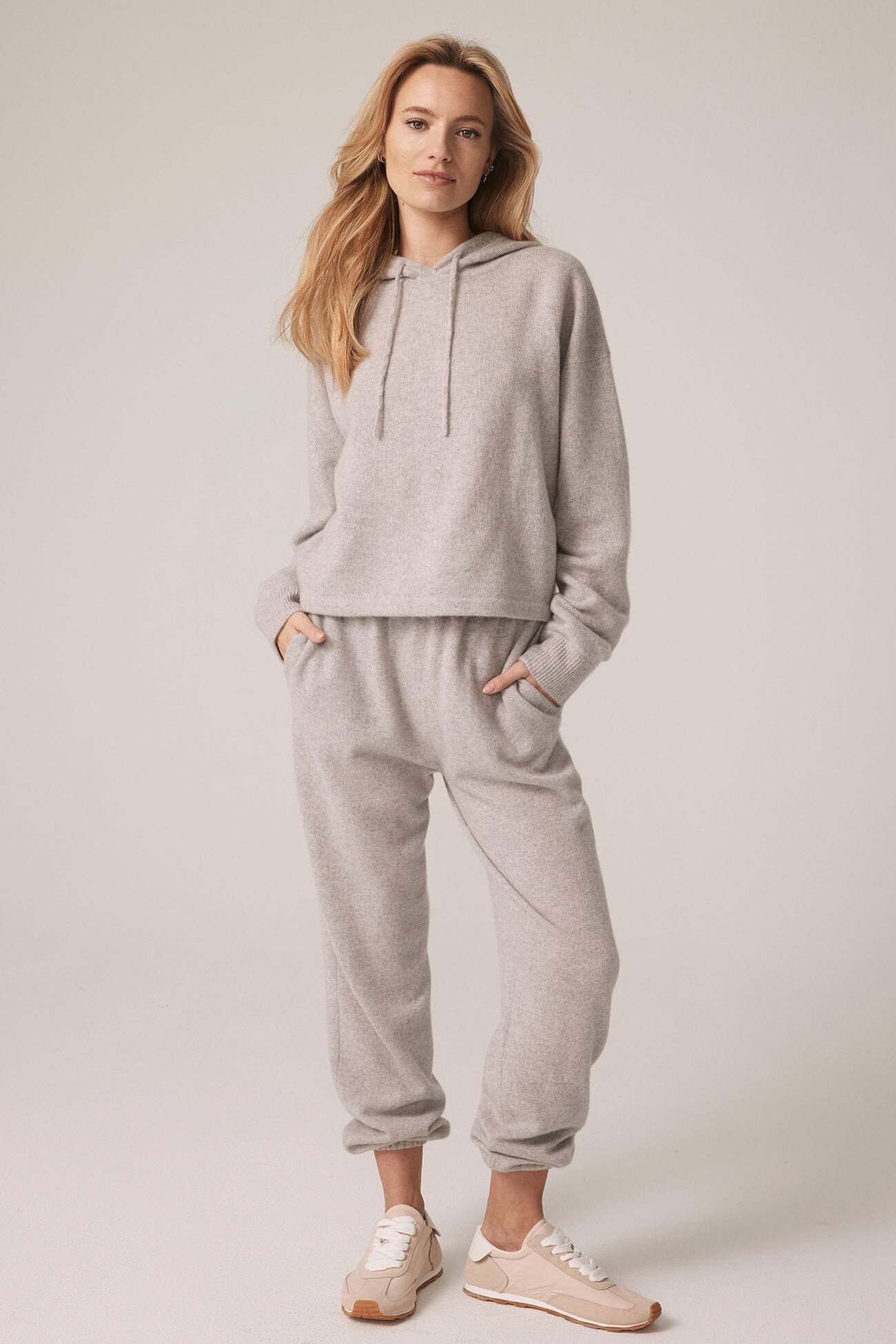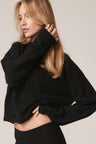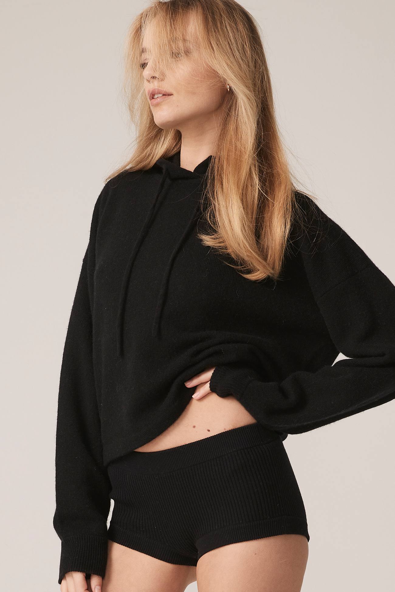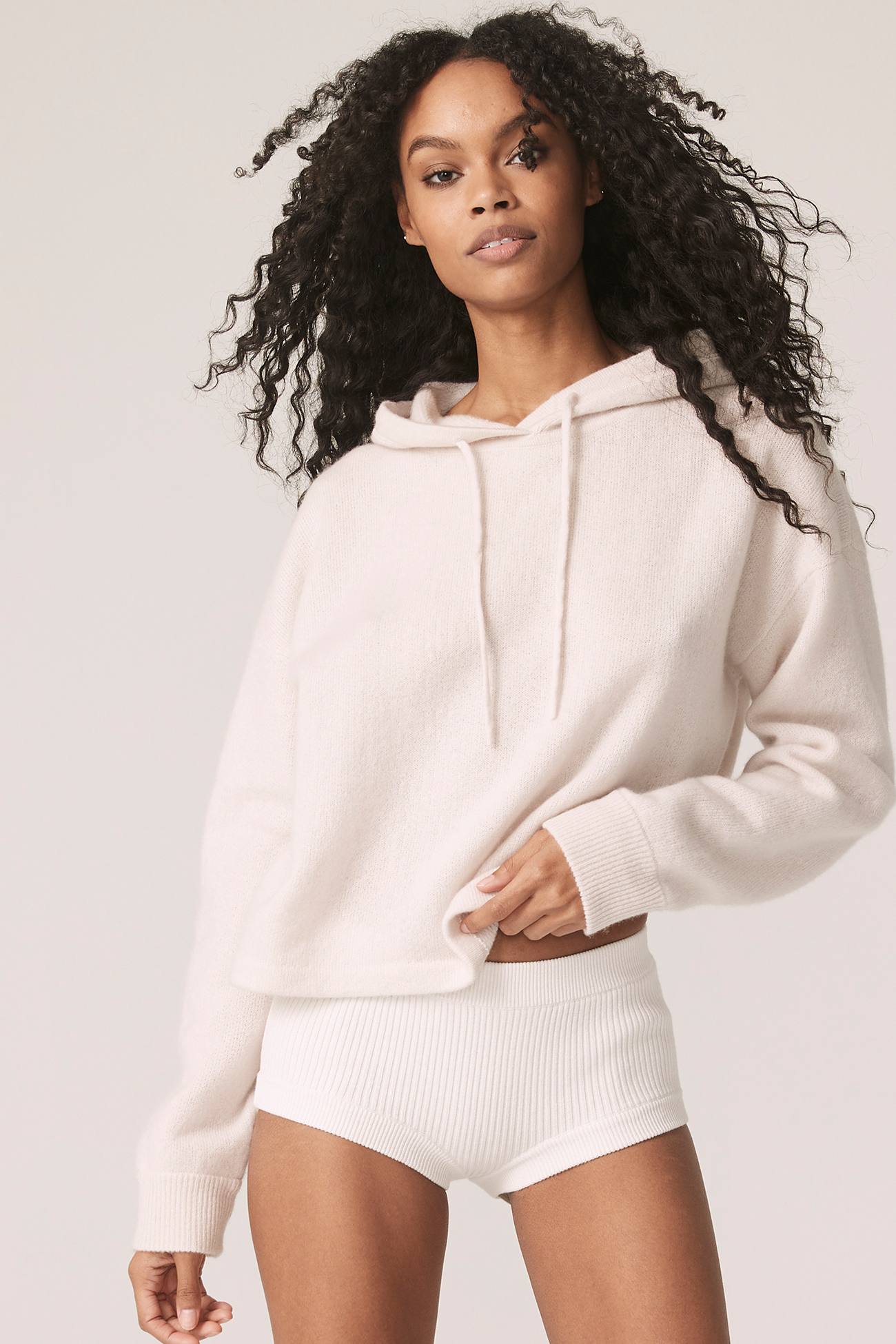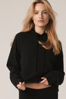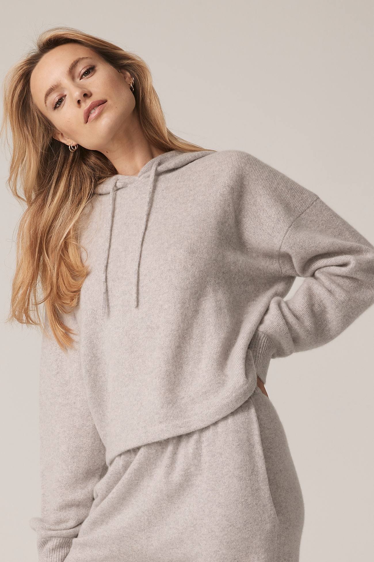 Long sleeve recycled terry cashmere hoodie. Cut in a versatile cropped length, drawstring hood and ribbed cuffs.