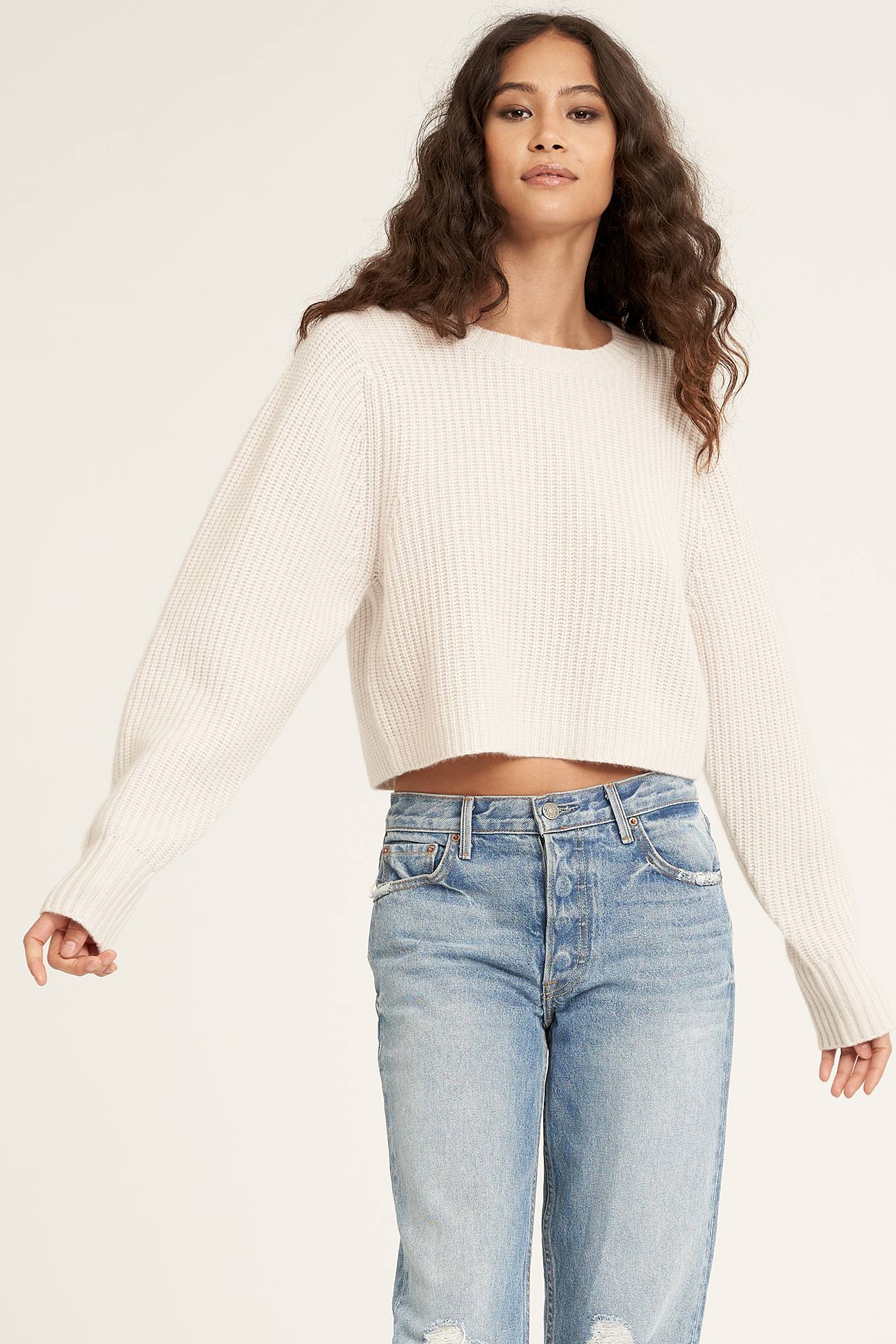Staple pullover featured in a soft ribbed knit and boxy, cropped silhouette with ribbed detail at sleeve cuffs for added dimension.