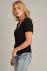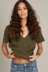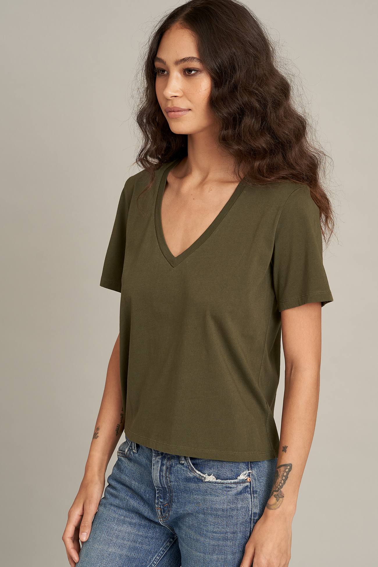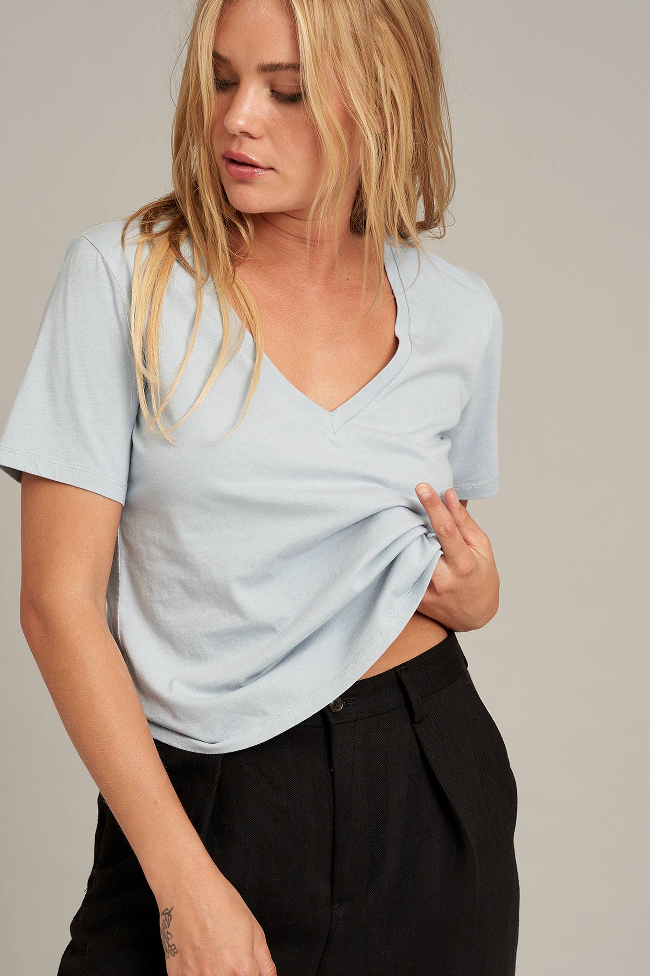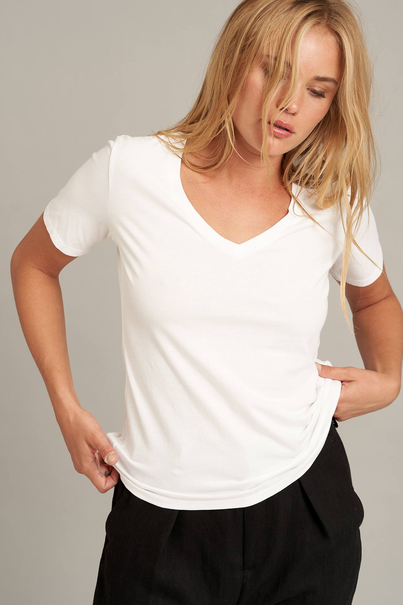 The Samantha V-neck is the perfect tee. Handcrafted in France from 100% cotton silk. Features a relaxed fit and short sleeves. Style with your favorite denim shorts or jeans.